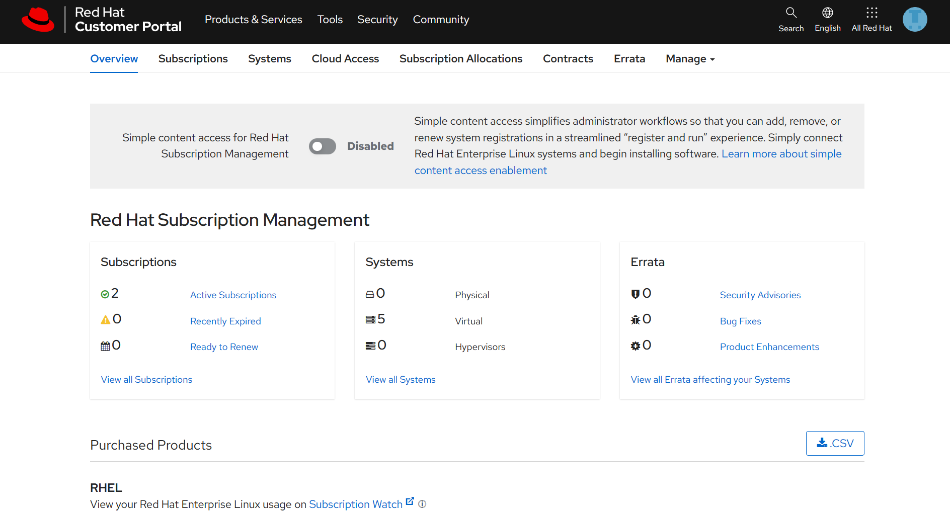 Simple content access for Red Hat Subscription Management 红帽订阅管理的简单内容访问,注意是关闭;