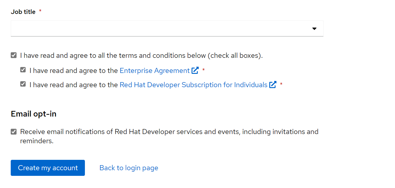 进入 Register for a Red Hat account 页面,全部勾选;