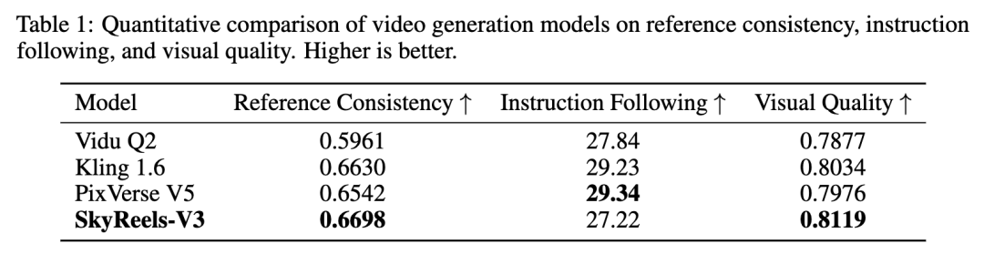 结果显示,在参考一致性、视频质量这两个核心指标上,SkyReels-V3直接超越了市面上的主流商业模型。
