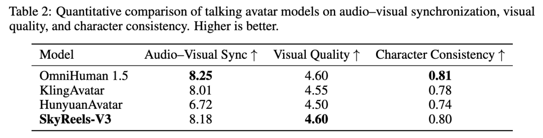 SkyReels-V3这项能力的音视频同步性得分高达8.18,视觉质量4.60,比肩甚至超越了行业顶尖的OmniHuman 1.5。