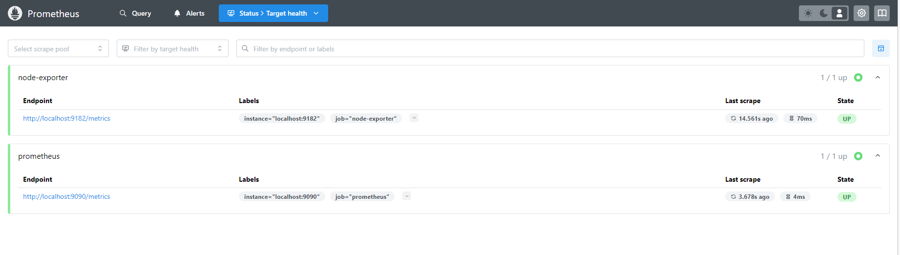 在"Targets"页面,你应该看到一个名为"node-exporter"的目标,并且其状态应为"UP"。