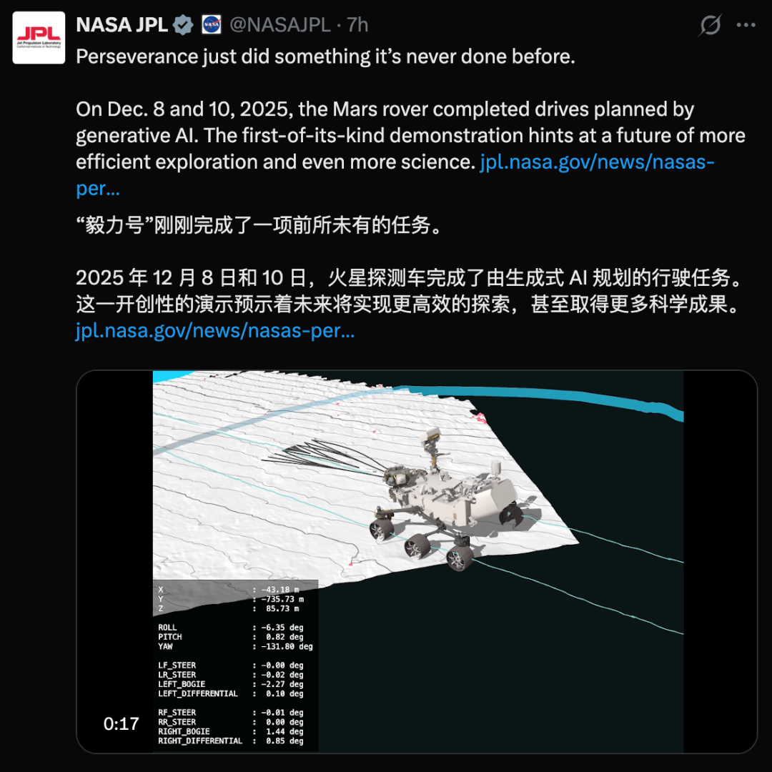 就在刚刚,NASA官方确认:人类历史上首次由AI全权规划的外星行驶任务,圆满完成!