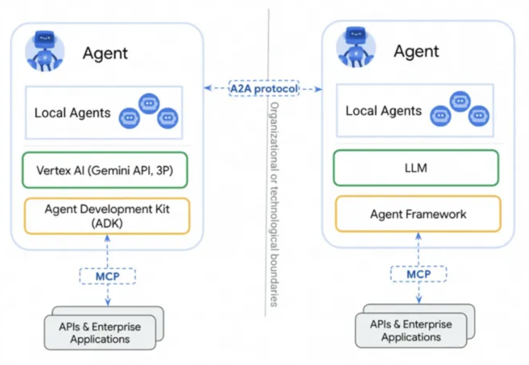 这时候A2A登场了(其实更像是进阶版的MCP)。A2A像一门统一的语言,让Agent ”说人话“,清晰的传递意图、协商任务、共享信息。能够连接任何其它的基于 A2A构建 Agent,并使用户能够灵活组合来自不同供应商的Agent。最重要的是,企业可以通过标准化方法管理其跨不同平台和云环境的 Agent。