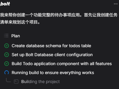 将需求以自然语言指令发送给AI后,你会看到 Bolt.new 开始工作,AI 会先尝试理解了你的需求,然后创建任务清单