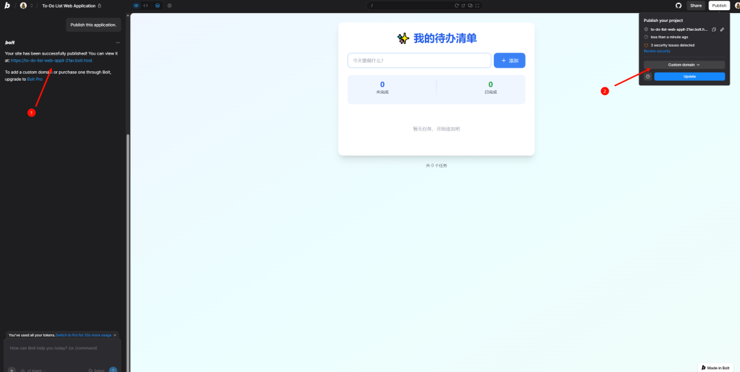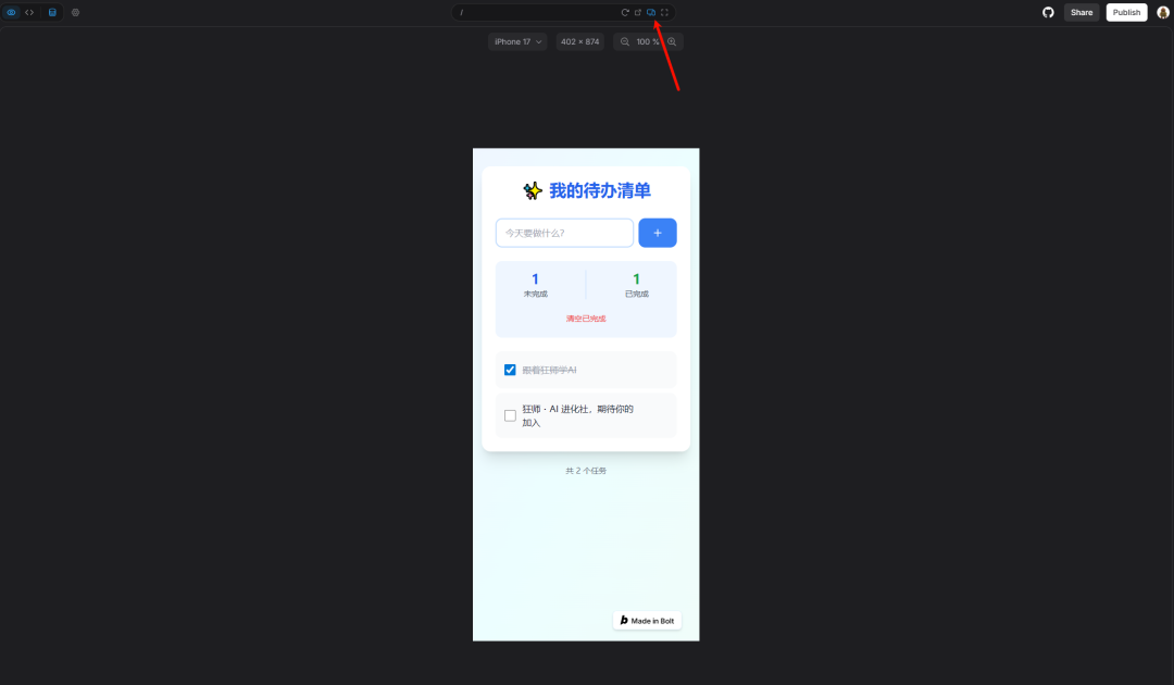 💡 如果你觉得这个地址比较丑,不好记,Bolt.new 还支持自定义域名,但是仅高级版可用(要收费),觉得没必要,不建议弄。