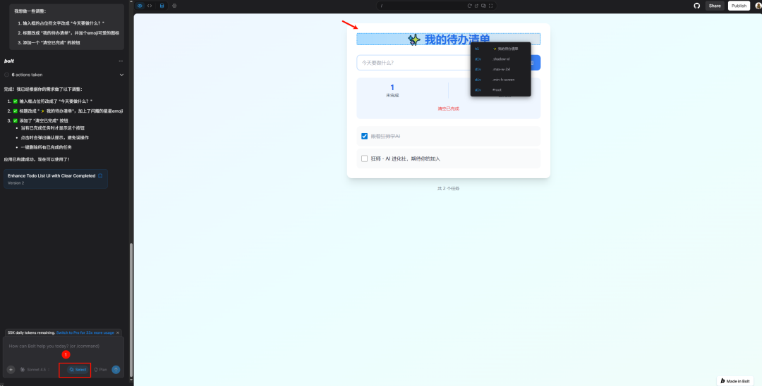 除了上述,可以直接在对话框中输入自然指令外,Bolt.new还可以开启可视化修改功能,选中你想要修改的元素,哪里不爽点哪里~