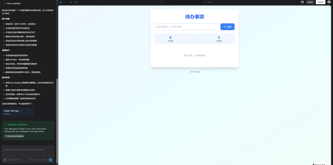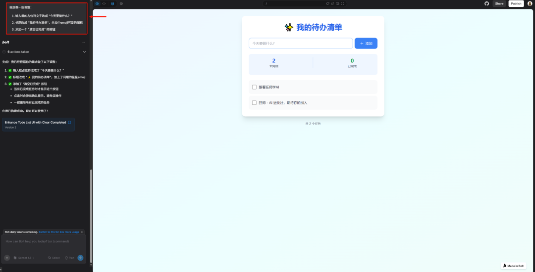 在 Bolt.new 的聊天框里,把上面整理好的需求作为提示词,输入到对话框,如输入以下内容(你可以直接复制):