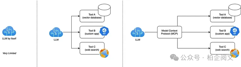 - 最右边:LLM通过MCP服务器连接工具。LLM不再直接和每个工具连接,中间加了个MCP层。LLM把请求发给MCP,MCP再把请求转发到正确的工具上(向量数据库、定制应用、网络搜索等等)。这样一来,LLM获取上下文信息和执行操作的方式都标准化了,添加新工具或者替换现有工具的时候,也不用改LLM的内部逻辑,架构变得简单多了。LLM只需要和MCP建立一个主要连接,其他的集成工作都交给MCP去处理。