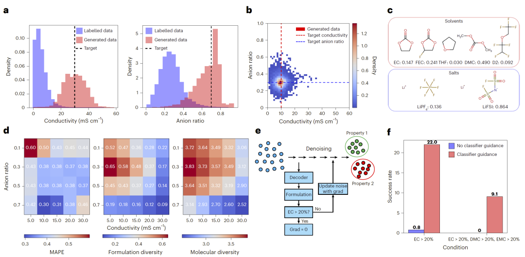 研究人员提出了一种统一的电解质设计框架,将前向预测模型与逆向生成模型相结合,利用实验数据与大规模分子动力学模拟数据训练机器学习系统,实现从分子到配方层级的精准建模。该框架能够预测离子电导率与溶剂化结构特征,并通过生成模型直接设计满足多目标条件的电解质配方。作为概念验证,研究人员实验筛选出三种同时具备高电导率和富阴离子溶剂化结构的电解质,其中一种展现出优异循环稳定性。该方法为数据驱动电解质设计提供了通用解决方案,并可拓展至其他复杂化学混合体系。