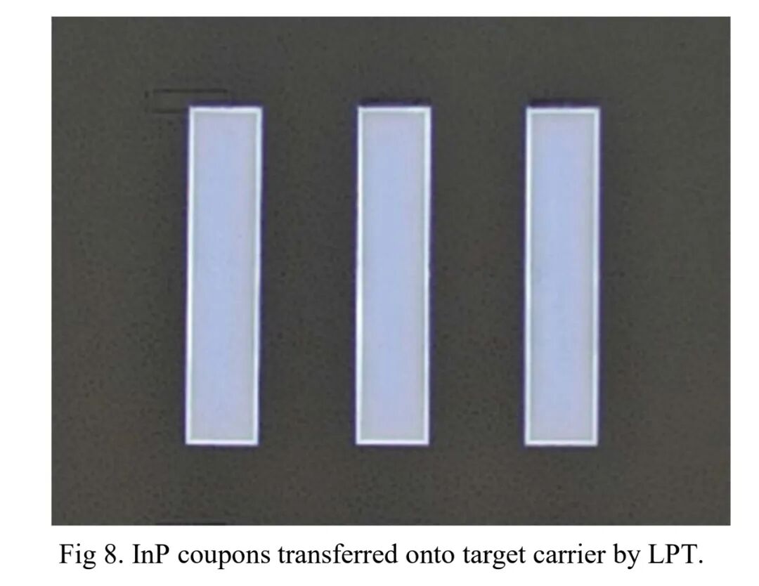 视觉检测结果显示,经过激光转移与融合键合后的InP芯片,未出现分层、物理损伤等缺陷,证明LPT技术能实现III-V芯片与硅波导的可靠键合。同时,转移后采用丙酮清洗芯片表面,可有效溶解残留的释放材料,清洗后的InP芯片表面无激光诱导痕迹、无分层等损伤,为后续加工提供了良好的表面条件。