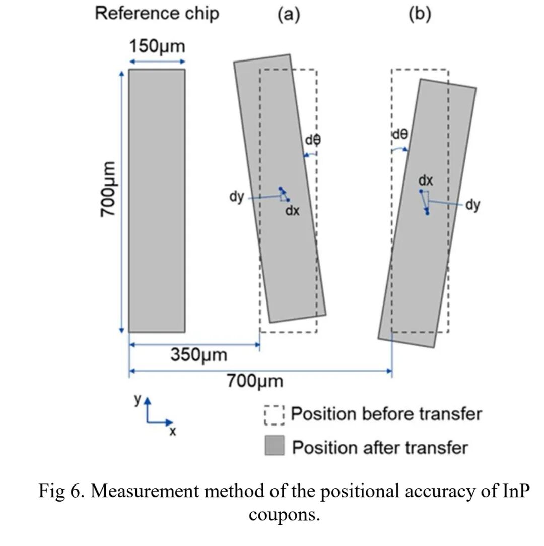 为评估LPT技术的转移精度,实验选取供体载体上三个相邻的InP芯片,在不改变间距的情况下转移至目标基板,通过图像识别软件对比转移前后参考芯片与相邻芯片的相对位置,重点检测水平方向偏移(dx)、垂直方向偏移(dy)及角度偏移(dθ)的变化,以此量化转移过程的位置稳定性。