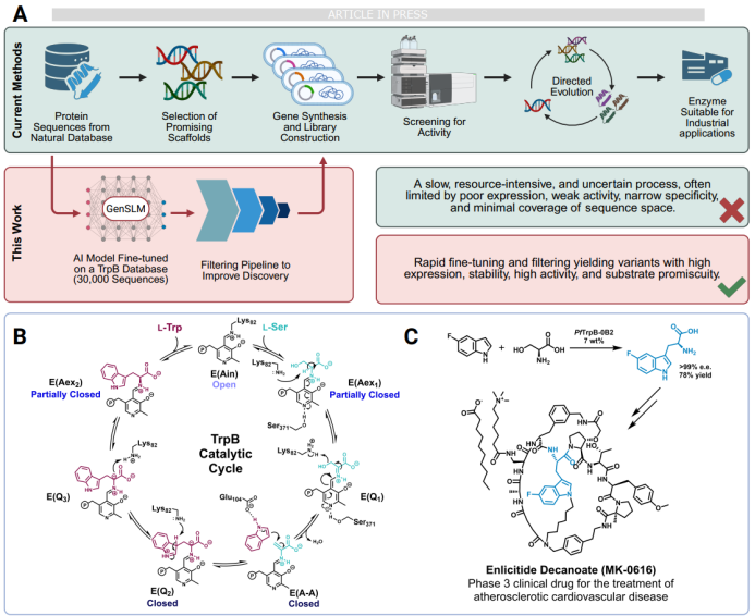 蛋白质在化学品、燃料、材料和药物的制备中应用广泛,是一种高效且可持续的生物催化剂。定向进化(directed evolution,DE)是一种天然蛋白质工程策略,它能够提高蛋白的多种性能,目前已经在工业界得到广泛应用。近年来,AI驱动的蛋白设计和自动化实验室在近期蓬勃发展,其能够赋能DE,将DE流程转化为“流水线”工作模式,进一步提高了蛋白质工程化的效率。然而,DE要求初始蛋白对目标反应具备一定的催化活性,因此在挑选初始蛋白时需要一定的经验,并且DE得到的蛋白绝大部分没有活性,因此DE工作流费时费力。蛋白质语言模型(PLM)可以生成一系列酶文库来筛选活性更高的蛋白,能够极大地拓展现有的蛋白质空间,可以作为上述缺点的解决方案。其中,基因组尺度语言模型(genome-scale language model,GenSLM)是一种特殊的PLM,不同于其他学习氨基酸序列的PLM,它在密码子水平学习DNA序列。本文中,作者利用GenSLM模型设计生成了多种色氨酸合成酶β-亚基(TrpB)的同源蛋白,这拓宽了GenSLM的应用范围,为AI驱动的蛋白质设计提供了全新的思路。