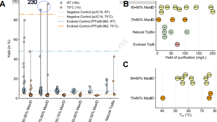图3. GenSLM-TrpB蛋白催化能力和理化性质。