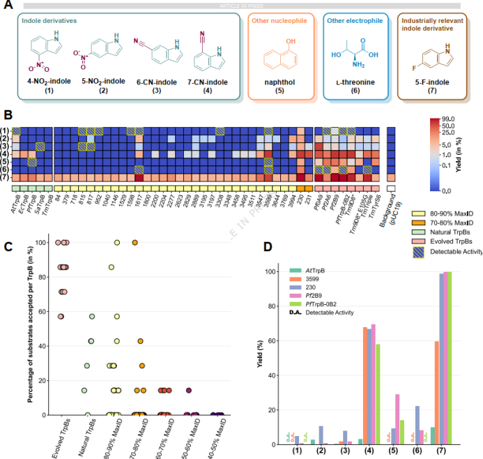 图4. GenSLM-TrpB蛋白催化非天然底物。