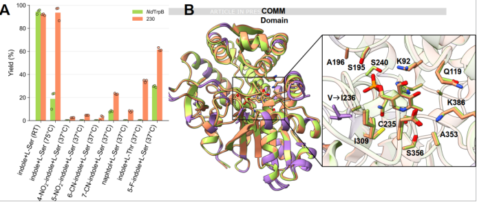 图5. GenSLM-TrpB 230蛋白与其最相似的天然同源蛋白NdTrpB的比较。