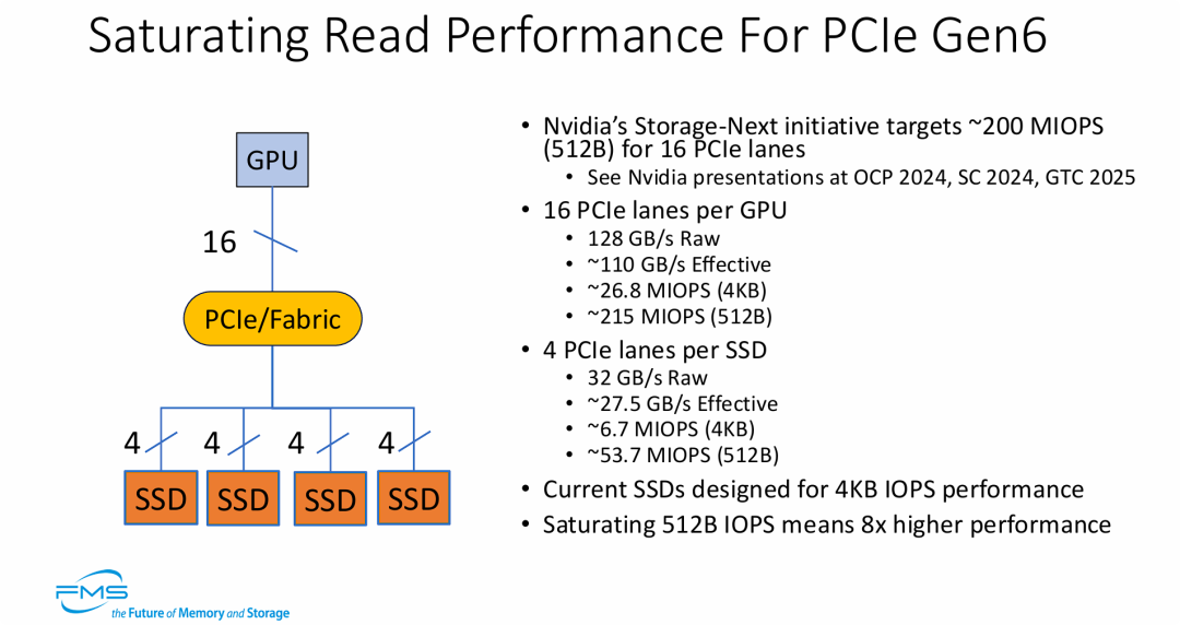 - 推演显示,在 PCIe Gen7 时代,为了填满 x16 通道的带宽,如果使用 512B 小数据块,系统需要处理高达 4.3 亿 (430 M) 的 IOPS。