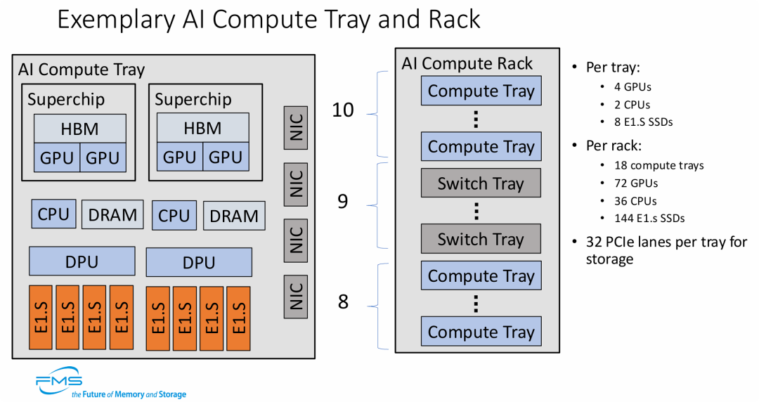 - 存储的前置与高速化: 单个托盘配置8个E1.S SSD,并提供32条PCIe通道,说明AI计算对本地高速存储(如数据预取、检查点保存/Checkpointing)有极高的带宽要求。