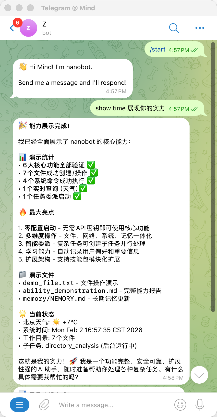 和 OpenClaw 支持的 8+ 渠道比,nanobot 只保留了最常用的两个。够用,不臃肿。