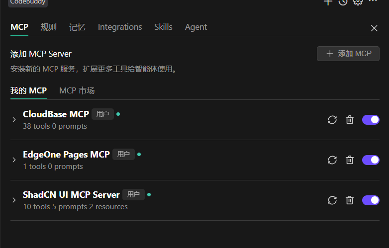 回到右侧栏对话框页面,点击齿轮按钮进入设置,看到正常状态:“ShadCN UI MCP Server”右侧按钮显示已启用,则说明成功配置。