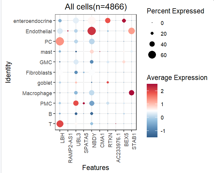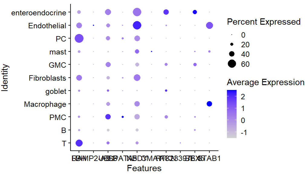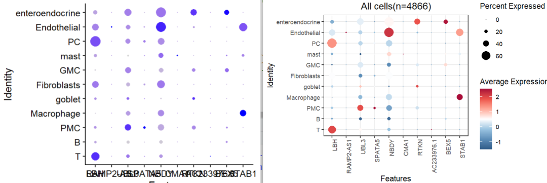 在单细胞数据分析的江湖里,Seurat无疑是绝对的王者。但是呢,标准流程只是起点,美丽的图表任重道远~默认的dotplot图长这样: