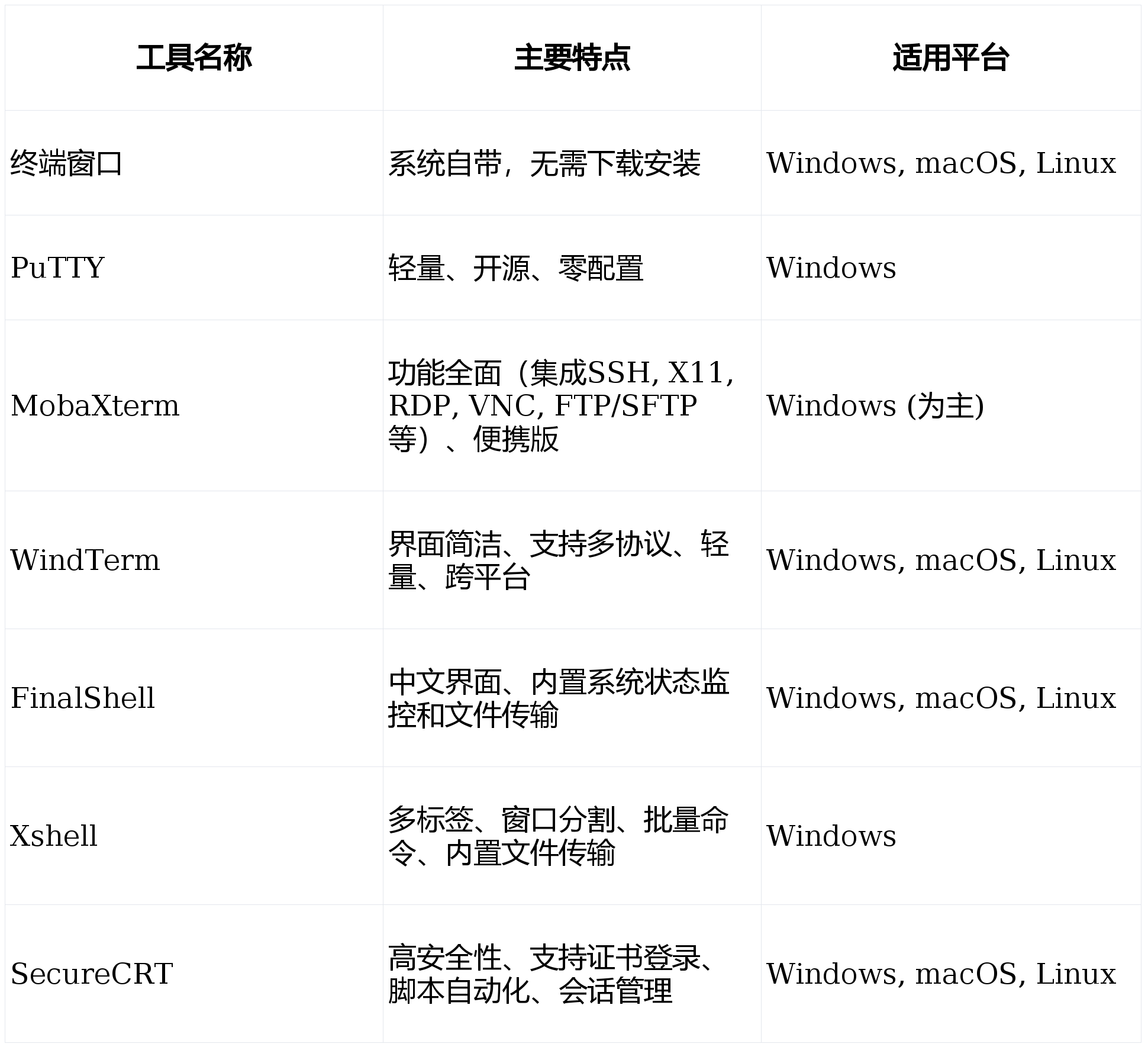 SSH(Secure Shell)是远程安全访问和管理系统的核心工具。下面这个表格汇总了几款常见SSH工具的主要特点,方便你快速了解。