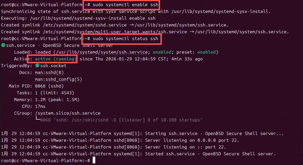b) 设置SSH服务开机自启,为了确保每次开机时SSH服务自动启动,你可以设置SSH服务为开机自启,并通过查询命令,可以看到服务已经启动