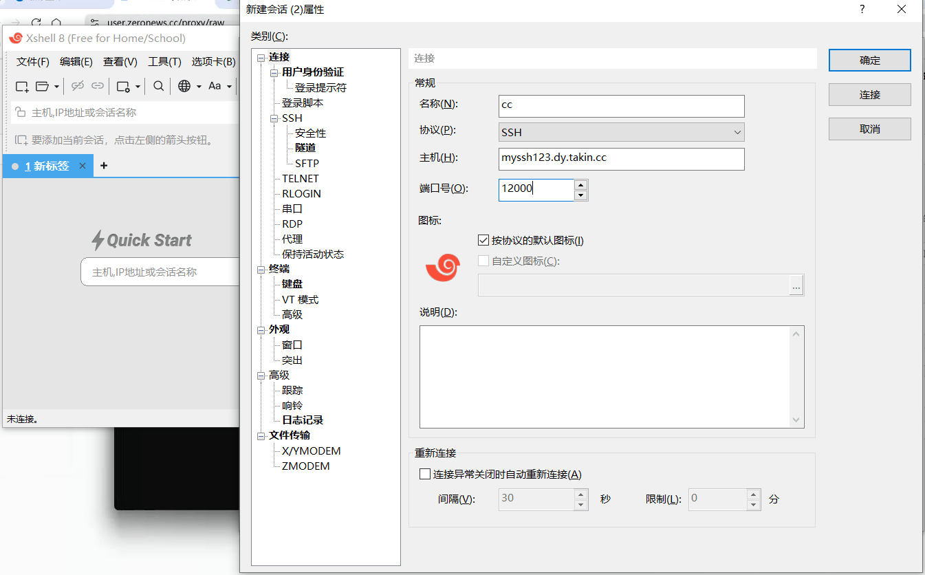 协议:选择SSH 主机:通过ZeroNews配置的映射的 域名