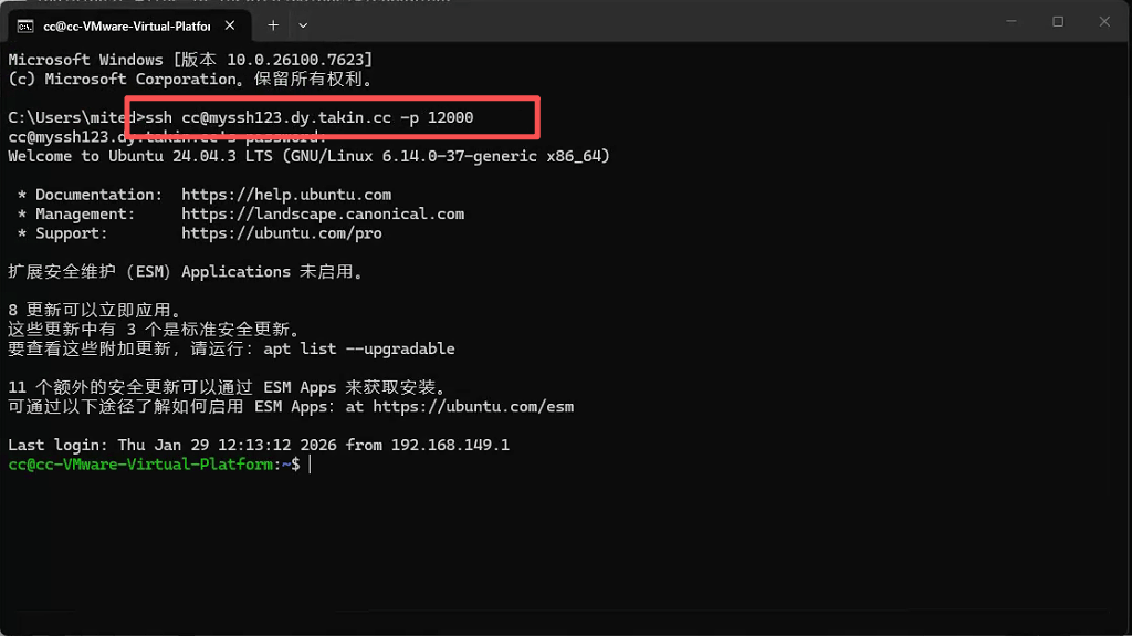 配置完成后,在异地网络通过SSH连接时,使用以下命令格式: