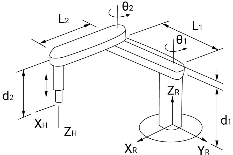 T₀⁴ = T₀¹(θ₁) · T₁²(θ₂) · T₂³(d₃) · T₃⁴(θ₄)T₀¹ = [cosθ₁ -sinθ₁ 0 a₁cosθ₁]