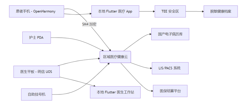 本文基于某省级区域医疗中心“鸿蒙版智慧医疗平台”项目,完整呈现一个 符合等保三级、支持国密全链路加密、全栈信创适配的 Flutter + OpenHarmony 智慧医疗健康平台 的设计与实现,涵盖电子病历调阅、远程会诊、离线问诊、无障碍就医等核心能力。