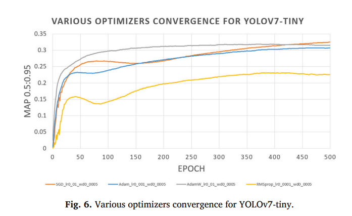 最新的六个SOTA YOLO目标检测模型都使用了SGD作为优化器,这表明该优化器已非常成熟,并且能为此特定的计算机视觉任务带来平滑的模型收敛。我们测试了使用Adam优化器,学习率0.001(如YOLOv7官方代码库所推荐),并训练了与SGD相同的500个轮次,但模型只达到了32.1%的𝐴𝑃𝑣𝑎𝑙_50-95,比使用SGD时低了1.5%。我们还使用AdamW和RMSprop优化器以及多种学习率和权重衰减进行了测试,训练了相同的500个轮次。在图6中,我们展示了四种优化器(SGD、Adam、AdamW和RMSprop)的最佳配置下,验证集mAP随训练轮次的收敛情况。图中可以清楚地看到SGD(橙色线)取得了最好的结果。基于这些原因,并为了与之前的YOLO版本保持一致,我们决定在后续所有实验中继续使用SGD作为优化器。