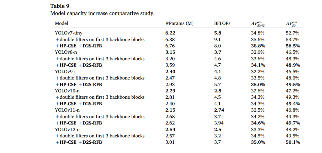 使用HP-CSE和D2S-RFB使得模型在𝐴𝑃𝑣𝑎𝑙_50-95上相比单纯增加模型容量平均提高了1.0%,这是YOLO模型五种最新纳米架构之间平均性能提升(0.3%)的三倍多。提升最大的是YOLOv7-tiny(3.2%)和YOLOv9-t(1.5%),而提升最小的是YOLOv12-n(0.5%)和YOLOv11-n(0.4%)。对于YOLOv10-n,当前3个骨干块的滤波器加倍时,获得的模型参数量增加了17%,BFLOPS增加了10%,但达到了与使用HP-CSE和D2S-RFB改进的模型相同的检测性能。所获得的结果表明,检测性能的改善部分归因于模型容量的增加,模块内块的结构和排列顺序也有重要贡献。