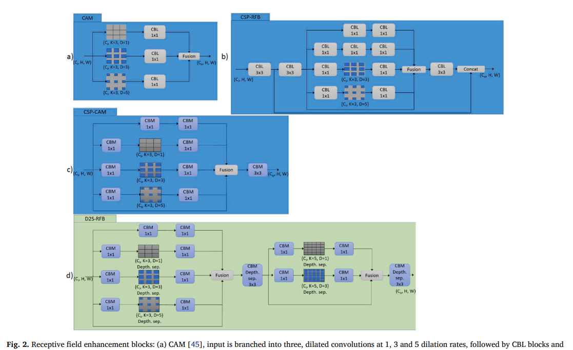 对于卷积层,感受野指的是输入层中对最终输出元素有贡献的元素区域。这种机制影响模型学习长距离空间特征关系的能力。感受野块(RFB)[42]引入了融合膨胀卷积输出以及逆高斯权重初始化的思想。受人类视觉机制启发的RFB模块首次应用于[43]中的目标检测网络。跨阶段局部感受野块(CSP-RFB)[44]为移动设备提出了一种重新设计的轻量级RFB块,其中主要使用逐点卷积,仅使用两个膨胀卷积。上下文增强模块(CAM)[45]使用三个膨胀卷积,比CSP-RFB [44]更紧凑。该块被添加到YOLOv5的颈部以改善特征的上下文信息。