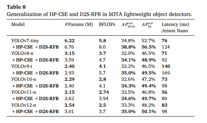 为了证明我们提出的HP-CSE和D2S-RFB模块的跨架构泛化能力,我们将其引入到几个SOTA轻量级目标检测器中,即YOLOv7-tiny[14]、YOLOv8-n[3]、YOLOv9-t[5]、YOLOv10-n[6]、YOLOv11-n[2]和YOLOv12-n[1]。我们根据官方代码库提供的说明和配置,在输入尺寸416下从零开始训练模型。在每个架构中,我们在骨干部分添加一个D2S-RFB块,在颈部添加数量不等的HP-CSE块(取决于模型架构)。我们调整D2S-RFB块中的卷积核数量以匹配原始模型。对于YOLOv7-tiny,我们使用64,而对于所有其他模型,我们使用32。对于YOLOv7-tiny、YOLOv8-n、YOLOv10-n、YOLOv11-n和YOLOv12-n,HP-CSE块的数量为四个,而YOLOv9-t使用了六个这样的块。对于HP-CSE块,我们将压缩比设置为16。我们在表8中展示了将我们的模块添加到每个SOTA YOLO架构后的结果。