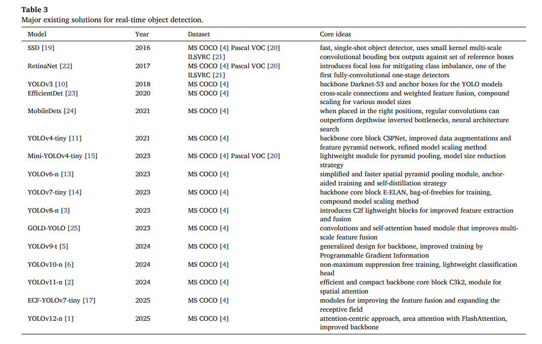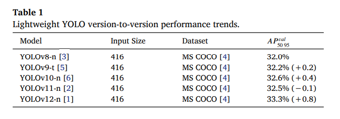 return self.act(out)实时目标检测是计算机视觉领域的研究焦点,旨在低延迟下精确识别并定位图像或视频流中的物体。尽管已有算法在此问题上取得了显著进展,但在边缘设备上实现准确的实时检测仍面临挑战。尽管架构有重大进步,但在最新的最先进(SOTA)模型中,轻量级目标检测器的检测性能仅得到边际改善。在416输入图像分辨率下,五种最新的YOLO模型纳米架构之间的平均性能提升为0.3%,最大提升(YOLOv12-n [1] 与 YOLOv11-n [2] 之间)为0.8%,如表1所示。