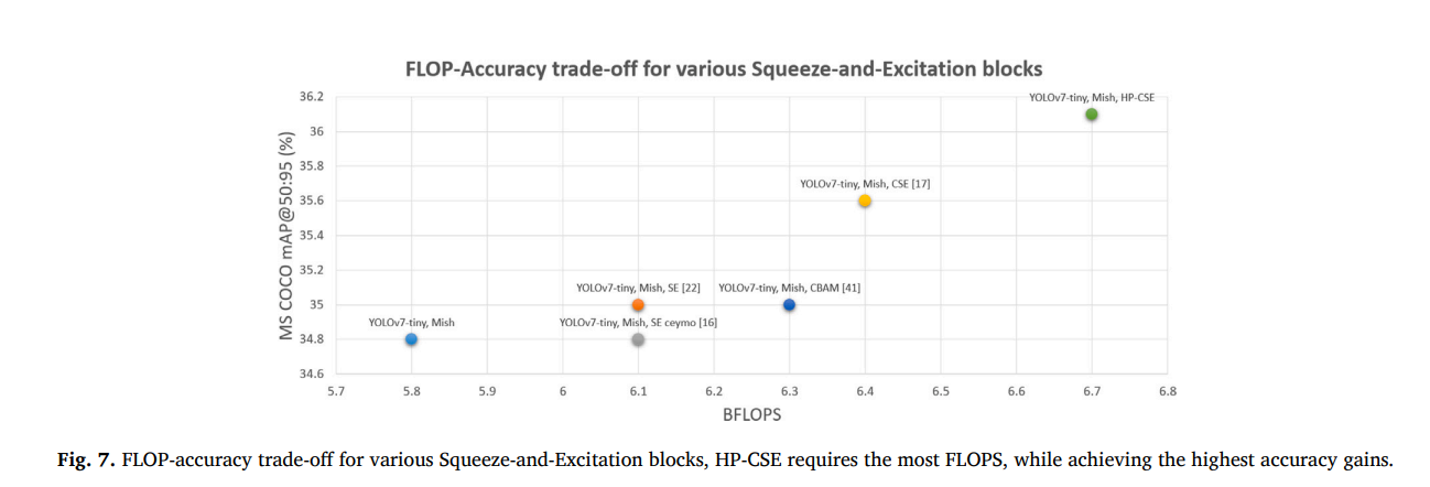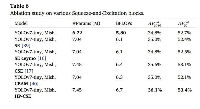 我们的初步实验是测试各种压缩激励(Squeeze-and-Excitation)块对整体目标检测性能的影响。我们将这些块的压缩因子配置为1,并在表6中展示了获得的结果。带有HP-CSE块的模型需要增加最多的模型参数和BFLOPS,但也获得了最佳的检测性能提升。与普通的YOLOv7-tiny相比,添加我们的HP-CSE块需要增加19.7%的模型参数和15.5%的BFLOPS,同时将𝐴𝑃𝑣𝑎𝑙_50-95提高了1.3%,将𝐴𝑃𝑣𝑎𝑙_50提高了0.7%。各种压缩激励块的FLOP-精度权衡如图7所示,其中可以观察到HP-CSE需要最多的FLOPS,同时获得了最高的精度增益。