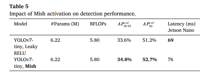 接下来,我们希望确定要使用的激活函数,我们比较了Leaky RELU和Mish[32]。我们在表5中显示,切换到Mish对参数数量和BFLOPs没有影响,同时将𝐴𝑃𝑣𝑎𝑙_50-95提高了1.2%,将𝐴𝑃𝑣𝑎𝑙_50提高了1.5%。由于Mish计算复杂度更高,使用Mish的模型的延迟增加了10%。我们认为这种权衡是可以接受的,在接下来的实验中,Mish将是我们模型架构中使用的激活函数。