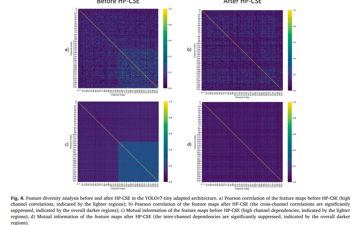 为了验证HP-CSE在减少特征冗余方面的有效性,我们分析了在包含HP-CSE的YOLOv7-tiny模型架构中,HP-CSE块提取的特征图的通道相关矩阵和互信息。图8显示了HP-CSE块之前通道间的皮尔逊相关系数和互信息(第一列),以及HP-CSE之后的结果(第二列)。