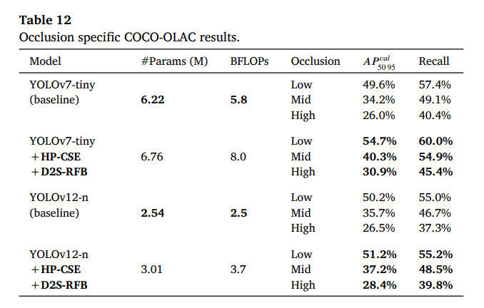 为了系统性地评估和量化不同遮挡水平下的检测性能,我们在MS COCO数据集的COCO-OLAC[58]划分上评估了YOLOv7-tiny和YOLOv12-n以及它们各自的改进版本。COCO-OLAC为MS COCO验证数据集提供了三个划分:高、中、低遮挡样本。使用给定的划分,我们为每个遮挡级别分别计算目标检测统计指标,并将结果呈现在表12中。可以观察到,所有模型在高遮挡数据上的表现都显著更差,而在低遮挡数据上则持续获得更好的结果。