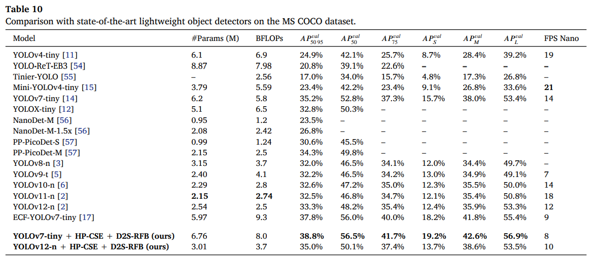 为了与其他SOTA轻量级目标检测器比较,我们寻找在输入尺寸416上训练、BFLOPS少于10、并且在NVIDIA Jetson Nano上实现实时检测速度的模型。由于一些模型仅在640输入尺寸上训练,我们必须将它们重新在416输入尺寸上从零开始训练,即YOLOv8-n[3]、YOLOv9-t[5]、YOLOv10-n[6]、YOLOv11-n[2]和YOLOv12-n[1]。为了确保公平和有意义的比较,对于每个重新训练的模型,我们使用了作者在研究论文中或官方公开代码库中指定的超参数设置。对于YOLOv7-tiny,我们使用了作者在原始论文中报告的结果。我们在表10中展示了比较结果。