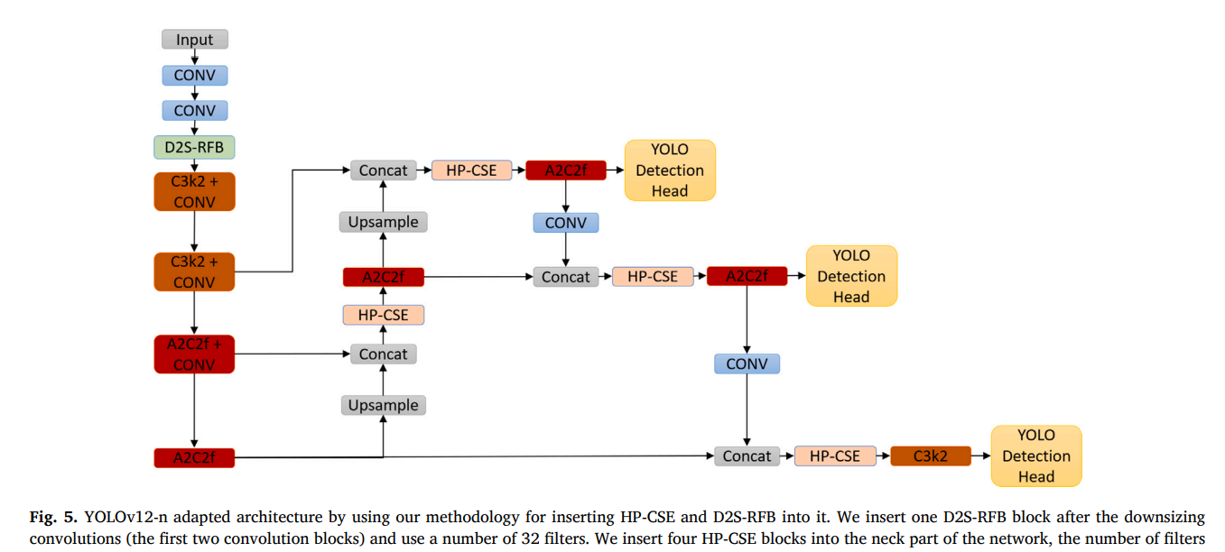 作为实际应用案例,我们展示了该方法论如何实际用于YOLOv7-tiny和YOLOv12-n。我们在图4中展示了应用我们提出的方法论后,YOLOv7-tiny的改进架构。获得的网络结构类似于ECF-YOLOv7-tiny[17],主要区别在于新的模块:一个D2S-RFB块和四个HP-CSE块。我们在图5中展示了我们带有HP-CSE和D2S-RFB的改进版YOLOv12-n架构。图4和图5中的YOLOv7-tiny和YOLOv12-n架构都是使用图3中所示的相同插入位置获得的,但其他块(卷积、骨干、颈部等)是原始模型架构特有的。