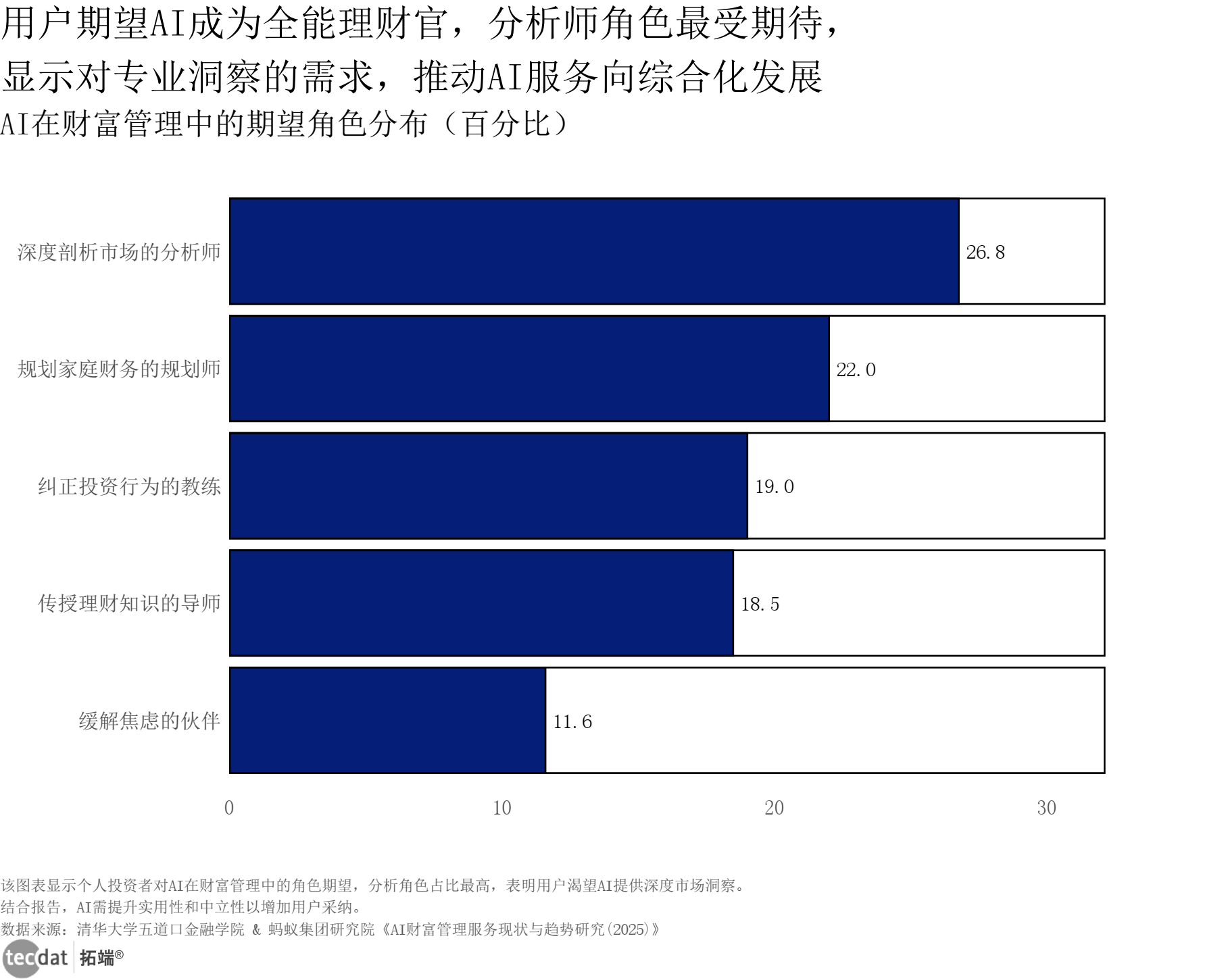 AI财富管理期望角色分布横向条形图表1数据及PDF模板已分享到会员群 3秒解读:个人投资者最期望AI成为“深度剖析市场的分析师”(26.76%),其次是“规划家庭财务的规划师”(22%)和“纠正投资行为的教练”(19%)。 对应人群行动建议:理财平台可优化AI分析师功能,强化市场洞察输出;财富管理机构可推出AI+人工的混合服务模式。
