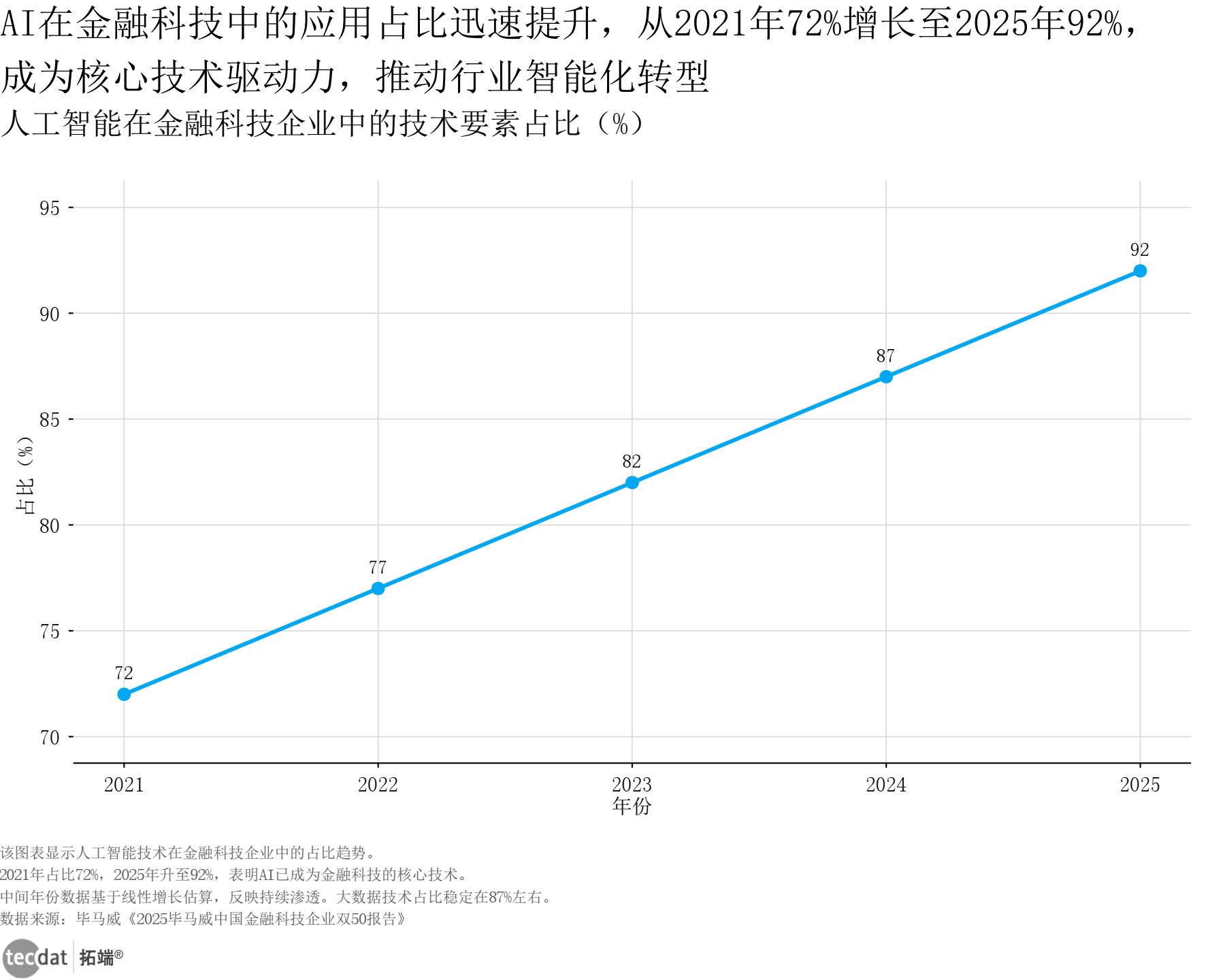 人工智能在金融科技中技术要素占比折线图表11数据及PDF模板已分享到会员群 3秒解读:AI技术要素占比从2021年72%升至2025年92%,连续两年位居技术要素首位,成为金融科技创新核心动力。 对应人群行动建议:金融科技企业可将AI技术投入占比提升至研发预算的50%以上;高校可加强金融AI复合型人才培养。