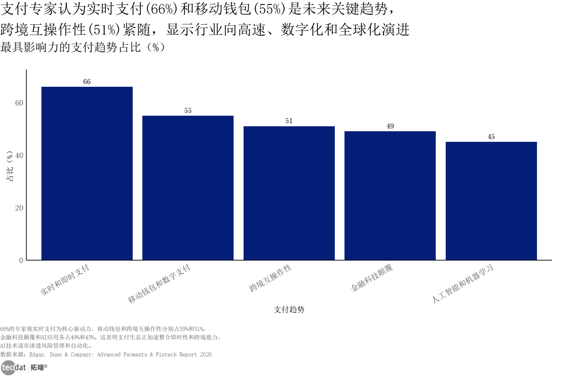 最具影响力的支付趋势占比条形图表17数据及PDF模板已分享到会员群 3秒解读:66%的专家认可实时和即时支付为核心趋势,55%看好移动钱包和数字支付,51%关注跨境互操作性,AI与机器学习应用占比45%,支付行业向高速、数字化、全球化演进。 对应人群行动建议:支付机构可加大实时支付技术投入;跨境企业可布局跨境互操作性解决方案,抓住全球化支付机遇。