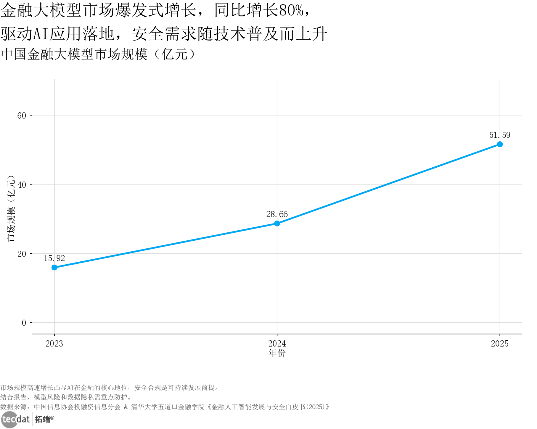中国金融大模型市场规模折线图表9数据及PDF模板已分享到会员群 3秒解读:2024年市场规模28.66亿元,同比增长80%,2025年预计突破50亿元,成为金融AI增长最快的细分领域。 对应人群行动建议:技术服务商可深耕金融大模型垂直场景优化;投资者可关注大模型训练、行业适配等产业链环节。