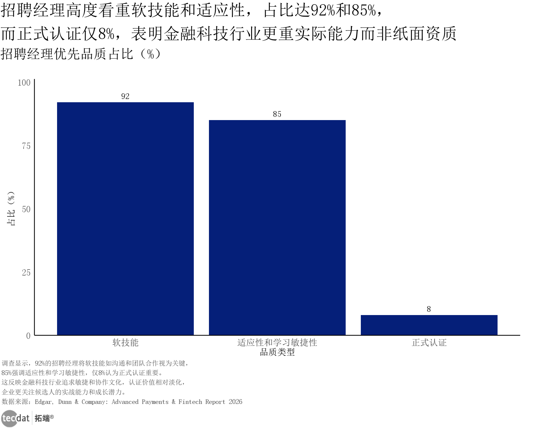 招聘经理优先品质占比条形图表16数据及PDF模板已分享到会员群 3秒解读:92%的招聘经理将软技能列为核心考察项,85%重视适应性与学习敏捷性,仅8%关注正式认证,实战能力成为核心招聘标准。 对应人群行动建议:职场人可重点提升沟通协作、快速学习能力;培训机构可调整课程体系,强化实操训练与软技能培养。