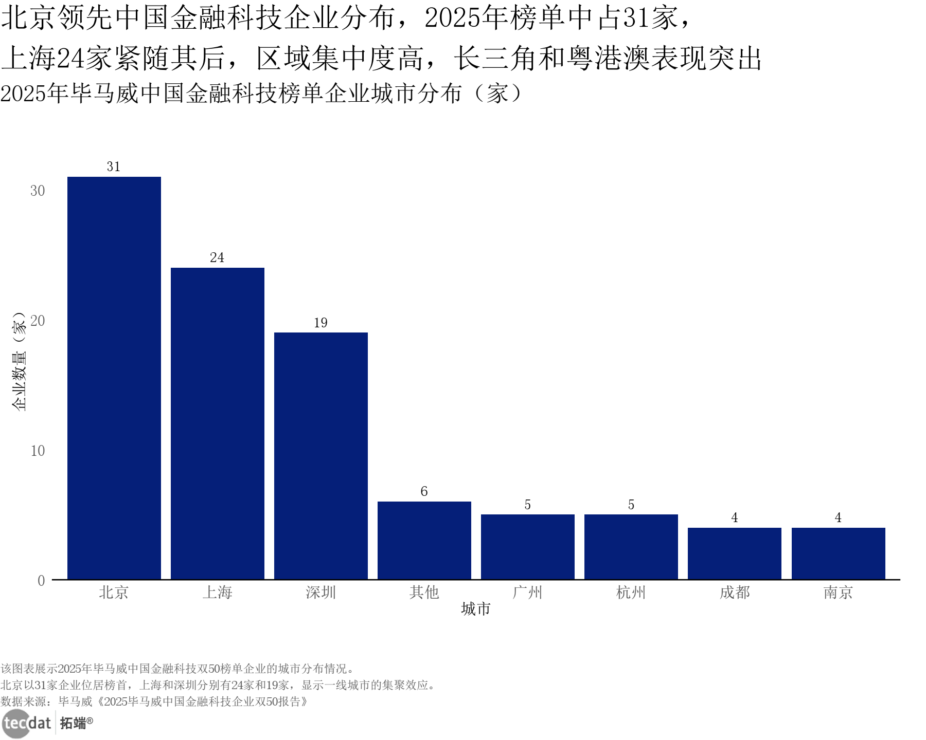 区域分布 | 未明确区域数据 | 北京31家、上海24家、深圳19家上榜 | 报告2提供具体城市分布 | 报告2基于榜单企业统计,报告1侧重全局趋势 |