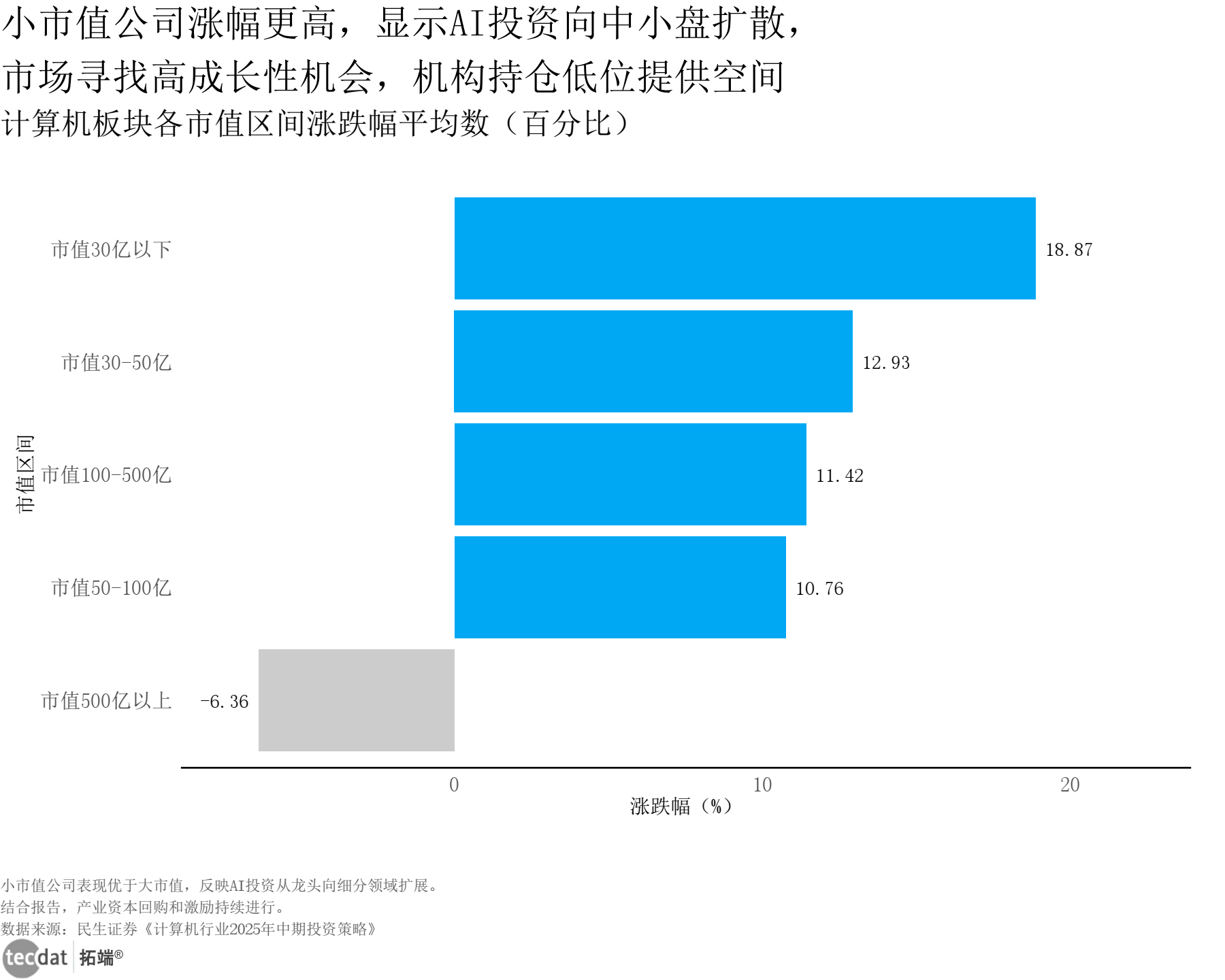 计算机板块各市值区间涨跌幅条形图表8数据及PDF模板已分享到会员群 3秒解读:小市值企业涨幅显著高于大市值企业,市值30亿以下企业涨跌幅达18.87%,AI投资向中小盘扩散。 对应人群行动建议:中小企业可聚焦细分场景AI创新;投资机构可加大对中小AI金融科技企业的调研覆盖。