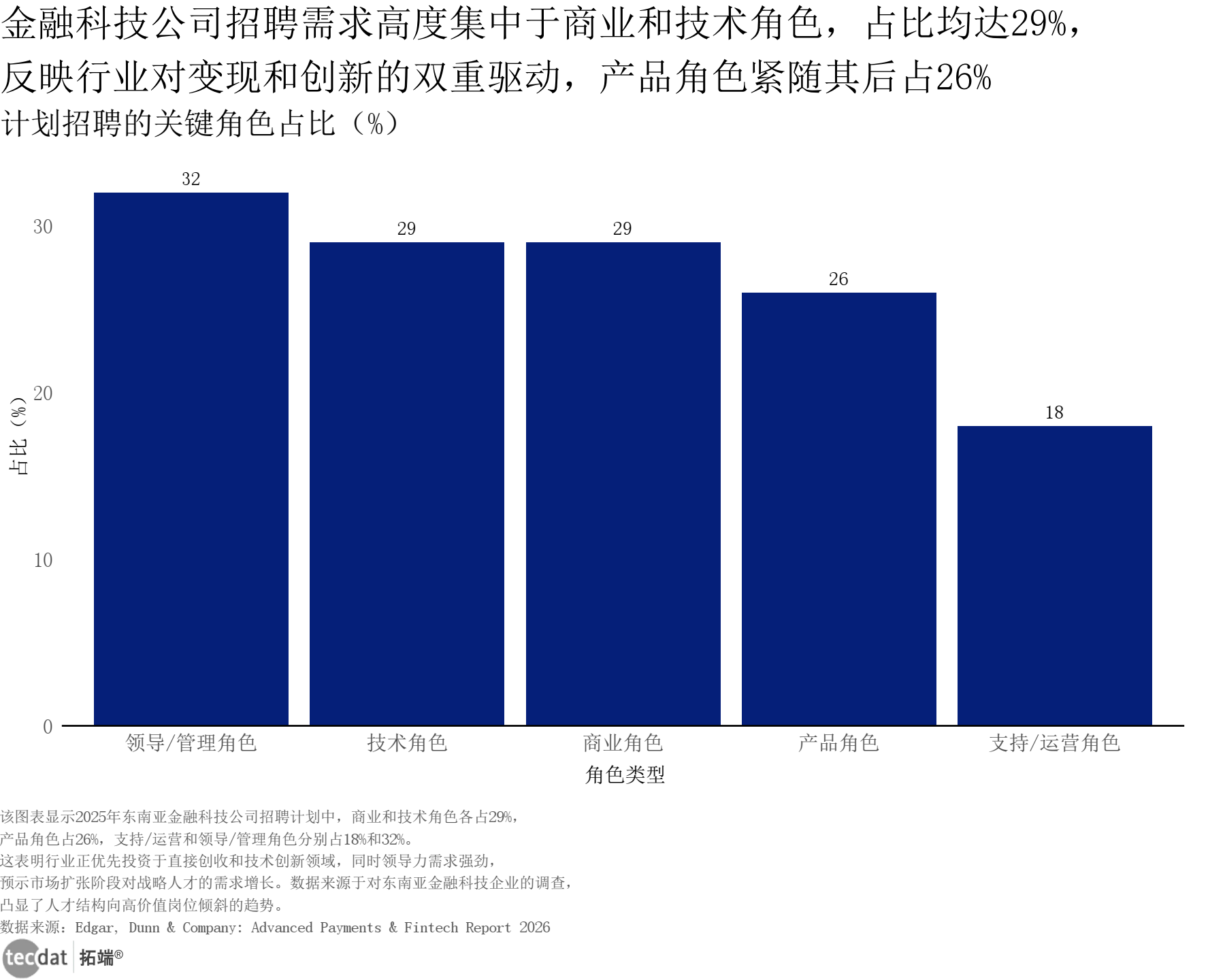 计划招聘的关键角色占比条形图表15数据及PDF模板已分享到会员群 3秒解读:金融科技公司招聘需求中,领导/管理角色占比32%,商业角色与技术角色各占29%,产品角色26%,支持/运营角色18%,战略型与实干型人才需求并重。 对应人群行动建议:求职者可强化“技术+商业”复合能力,瞄准高需求角色;企业可优化人才结构,平衡管理、技术与产品团队配置。