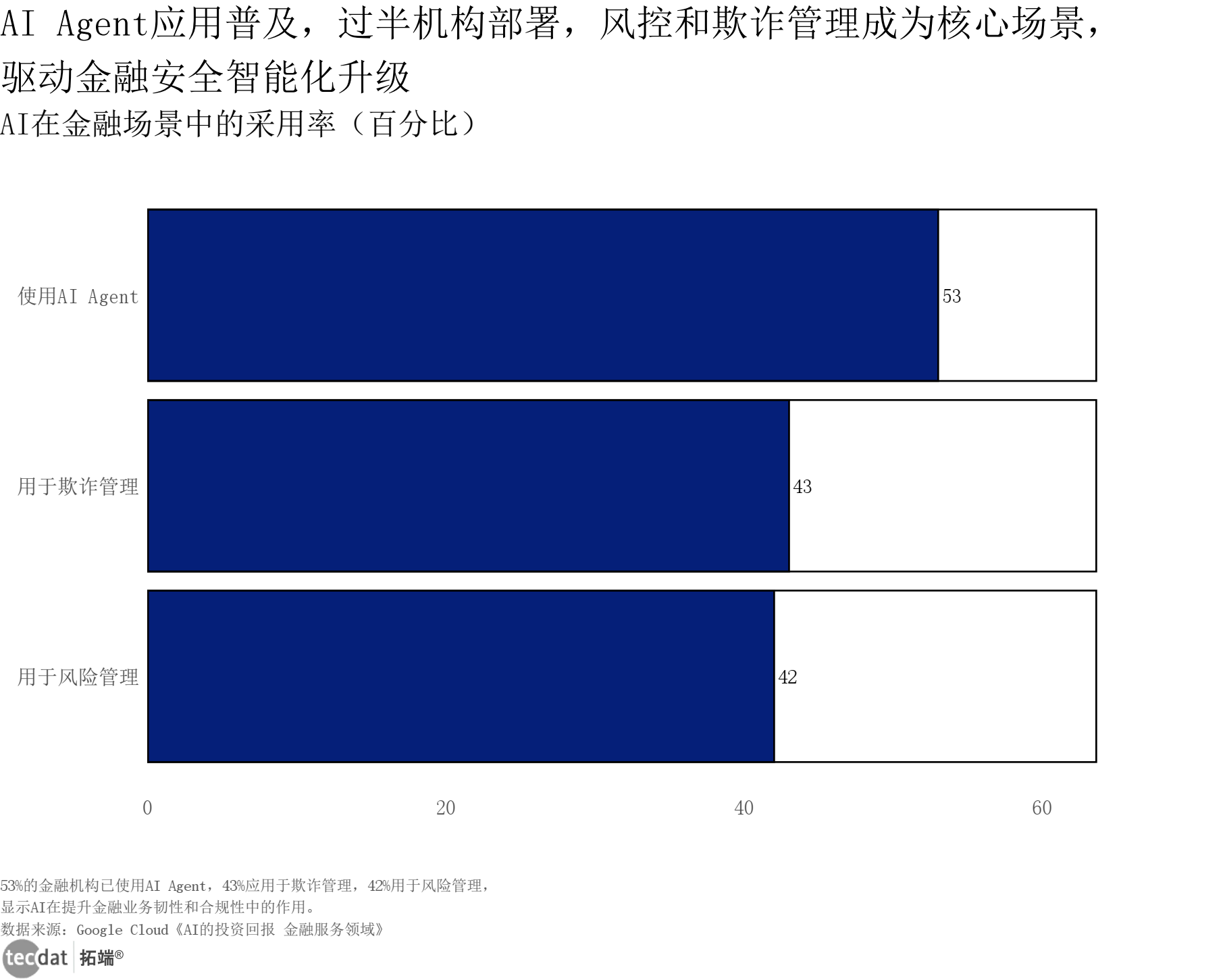 AI在金融场景中的采用率横向条形图表13数据及PDF模板已分享到会员群 3秒解读:53%的金融机构已使用AI Agent,43%应用于欺诈管理,42%用于风险管理,AI在风控领域的渗透率领先。 对应人群行动建议:风控团队可扩大AI Agent应用范围;合规部门可制定AI风控的标准化流程。